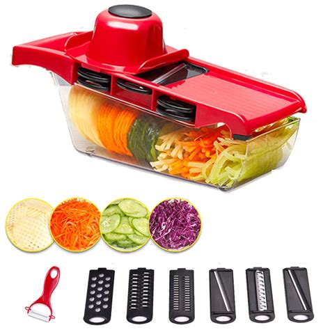 Yang pertama ada Mandoline Slicer . Alat ini biasanya berbentuk seperti papan miring dengan mata pisau yang super tajam di bagian bawahnya. Kalian tinggal letakkan sayuran di bagian atasnya, lalu geser-geser. Hasilnya? Irisan yang super tipis dan super rata , guys! Cocok banget buat bikin keripik sayuran, irisan kentang buat gratin , atau irisan timun buat salad. Kebanyakan mandoline slicer juga dilengkapi dengan pengatur ketebalan, jadi kita bisa atur seberapa tipis atau tebal irisan yang kita mau. Ada juga yang punya beberapa mata pisau berbeda untuk menghasilkan potongan yang berbeda-beda, seperti julienne atau dadu kecil. Tapi ingat, mandoline slicer itu pakenya harus ekstra hati-hati ya, guys, karena mata pisaunya tajam banget dan tangannya bisa gampang kena kalau nggak pakai pelindung yang biasanya udah included.