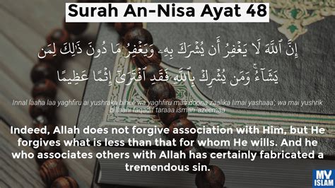 Let’s kick things off with the very first verse in this section, An Nisa Ayat 48 . This is a heavy hitter , guys. It starts by stating unequivocally that Allah does not forgive *shirk *. Whoa. That’s a strong statement, right? Shirk is the gravest sin in Islam, the act of associating partners with Allah or worshipping anything or anyone alongside Him. The verse goes on to say that while He doesn’t forgive shirk , He does forgive sins less than that for whomever He wills. This is a crucial point. It doesn’t mean Allah is unfair; it means He sets the ultimate boundary. Think of it like this: there are certain fundamental principles that are non-negotiable for maintaining a pure connection with the Divine. Shirk breaks that connection entirely. However, for other sins, Allah’s mercy is vast. If someone sincerely repents or if Allah, in His infinite wisdom and justice, decides to forgive them, He can. This verse also emphasizes that whoever associates partners with Allah has indeed fabricated a great sin . The emphasis here is on the magnitude of the sin. It’s not just a mistake; it’s a deliberate distortion of truth and a rejection of the Creator’s uniqueness.