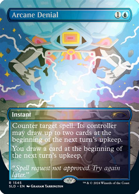 Alright, let’s get straight to the heart of it: what exactly is the Arcane Denial Secret Lair? In the vast universe of Magic: The Gathering , Secret Lairs are limited-edition sets featuring unique art styles and themes. They offer a fresh take on classic cards, and the Arcane Denial Secret Lair is no exception. Arcane Denial itself is a powerful counterspell, known for its ability to negate an opponent’s spell while giving them a consolation prize – card draw. This Secret Lair edition elevates the card with stunning, exclusive artwork that you won’t find anywhere else. Imagine playing a crucial game and dropping this card with its eye-catching design – talk about making a statement! The beauty of Secret Lairs lies in their collectibility and the unique flair they bring to your deck. They’re not just cards; they’re conversation starters and a testament to your dedication to the game. Whether you’re a seasoned player or just starting, adding an Arcane Denial Secret Lair to your collection can bring a new level of excitement to your Magic experience. Plus, who wouldn’t want to own a piece of Magic history with such a cool, artistic twist? These drops are often highly sought after, making them valuable additions to any collection. So, keep your eyes peeled and your mana ready – you won’t want to miss out on the chance to snag one of these beauties. Trust me, your deck (and your inner art collector) will thank you!