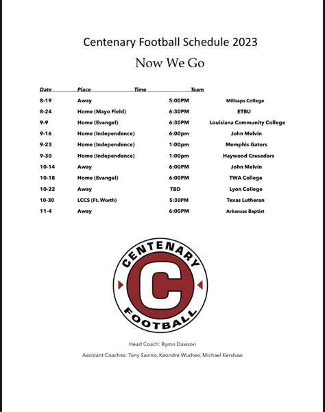 Alright, let’s kick things off by getting familiar with the Centenary Football Schedule . This is your bible, your roadmap, your key to football season bliss. The schedule isn’t just a list of dates and times, though – it’s a carefully crafted sequence of matchups, each one a potential epic battle on the gridiron. Knowing the schedule inside and out is crucial for planning your weekends, setting up watch parties, and making sure you’re there to witness every nail-biting play. This season, the Centenary Football team is gearing up for some seriously tough competition, so keeping tabs on their schedule is more important than ever. We’re talking about rivalries, conference games, and maybe even some surprise showdowns that could define the season. To help you stay on top of things, we’ll break down how to read and interpret the schedule. We’ll be talking about the date and time of each game, along with where the game will be played (home or away). Remember, knowing the schedule is the first step towards an unforgettable season. We’re gonna see how the season unfolds, from the opening kickoff to the final whistle. So, get ready to mark your calendars, because this is gonna be an amazing ride.