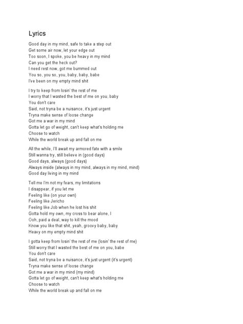 Now, let’s pull out our magnifying glasses and really zoom in on the lyrics of ‘Good Day In My Mind’ , because this is where the magic of SZA truly unfolds. Her words aren’t just placeholders; they’re meticulously chosen brushstrokes on a canvas of emotion, painting vivid pictures of her inner landscape. It’s like she’s handing us a journal entry, raw and unfiltered. This track really showcases her ability to make the deeply personal feel universally relatable . We’re not just listening to a song; we’re witnessing a masterclass in emotional depth through lyrical analysis . The beauty of SZA’s music lies in this capacity to turn complex feelings into simple, poignant statements, making us all nod along in understanding. Each phrase is carefully constructed to evoke a specific feeling, guiding us through her thoughts and allowing us to connect with our own similar experiences. It’s a testament to her songwriting prowess that she can create such a powerful impact with what might seem like straightforward lines. The layered meanings, the subtle nuances, and the sheer honesty packed into every verse make ‘Good Day In My Mind’ a standout track that demands repeated listens for full appreciation. This is where the true song meaning begins to reveal itself, like peeling back the layers of an onion, each layer uncovering a new facet of SZA’s profound artistry. This isn’t just about what she says, but how she says it, infusing every word with palpable feeling and an undeniable authenticity that captivates and connects. The way she uses imagery and sometimes even subtle repetition reinforces the core message, making it stick with you long after the song ends.