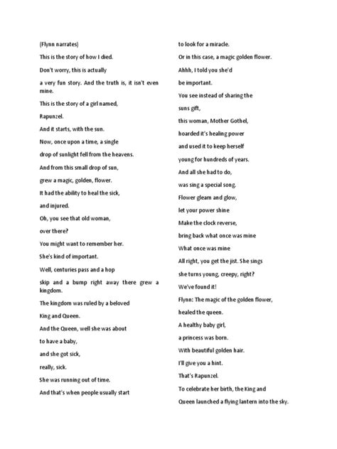 So, what exactly can you expect to find within the Tangled script download ? Think of it as the blueprint to the movie. You’ll see the scene headings that tell you where and when each moment takes place – from Rapunzel’s sun-drenched tower to the bustling streets of Corona and the dimly lit, creepy Snuggly Duckling pub. Then come the action lines , which describe what the characters are doing, the settings, and the overall mood. This is where you get a glimpse into the visual storytelling that the animators would later translate. You might read descriptions like “ Rapunzel, eyes wide with wonder, touches a petal for the first time ,” and then see how that translates into those breathtaking animation sequences. And of course, the dialogue ! Reading the lines spoken by Rapunzel, Flynn, Mother Gothel, and the whole colorful cast gives you a different perspective. You can see how the writers crafted Rapunzel’s blend of innocence and determination, Flynn’s roguish charm, and Gothel’s manipulative menace. Pay attention to the subtext – what characters aren’t saying can be just as important as what they are saying. You’ll also likely find parentheticals (those little notes in parentheses), which offer insights into how a line should be delivered – maybe it’s sarcastic, hesitant, or full of joy. For fans of screenwriting formats , the Tangled script will be presented in the standard industry format, making it easy to read and understand. It’s a fantastic way to learn the conventions of scriptwriting, which are pretty universal across film and television. You’ll see how acts are structured, how plot points are introduced and resolved, and how the pacing builds suspense and emotional impact. It’s a treasure trove for anyone interested in the art of filmmaking .