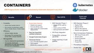 • Isolation: Each EDB instance runs in its own container, isolated from other applications. This prevents conflicts and improves security.
