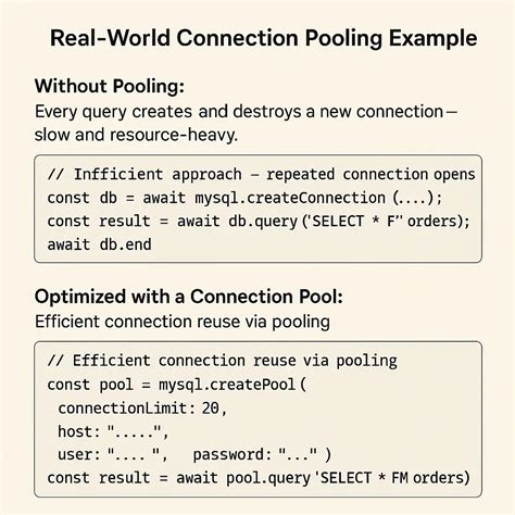 Think of it like this: Imagine you’re running a popular online store. Every time a customer views a product, adds an item to their cart, or places an order, your application needs to interact with the database. Without connection pooling, your app would have to establish a new connection to the database for each of these actions. This process involves several steps, including network communication, authentication, and resource allocation on the database server. All of this takes time and resources.