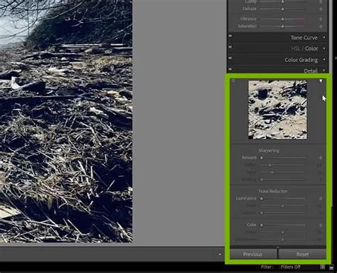 • Noise reduction: Use the noise reduction tools to reduce graininess in your image. This is especially useful for photos taken in low light.