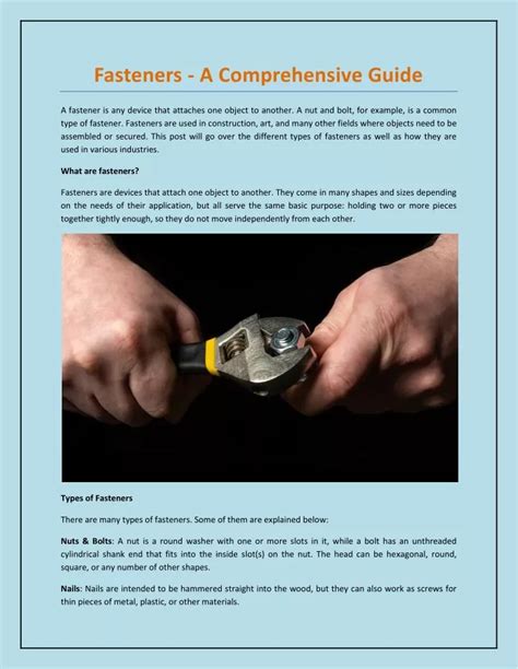 Alright, let’s wrap this up with some golden tips for installing your Gabi fasteners like a pro, guys! First off, always start with the right tool for the job. Using a screwdriver that doesn’t quite fit the screw head is a recipe for stripped screws and frustration. Make sure your drill bits, wrenches, or screwdrivers are the correct size and type for the fastener you’re using. Second, don’t overtighten . While you want a secure connection, overtightening can strip the threads, damage the material you’re fastening into, or even break the fastener itself. Apply firm pressure, and stop when the fastener feels snug and secure. For screws going into wood, consider pre-drilling pilot holes, especially in hardwood. This prevents the wood from splitting and makes driving the screw much easier. The size of the pilot hole should generally be slightly smaller than the screw’s core diameter. When working with nuts and bolts, ensure they are properly aligned before tightening. Using washers can also be a lifesaver. They distribute the load over a larger area, preventing damage to the material, and can help prevent the fastener from loosening due to vibration. For critical applications, use locking nuts or thread-locking compounds to prevent loosening over time. Finally, inspect your work . After installation, give the fastened components a good wiggle to ensure they are stable and secure. Regular checks over time can also catch any issues before they become major problems. By following these simple installation tips, you’ll ensure your Gabi fasteners perform exactly as they should, leading to stronger, more durable, and safer projects. Happy fastening!