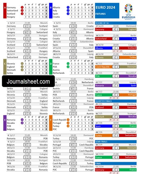 The schedule provides all the details you need to be fully prepared for the EURO 2024. Familiarize yourself with the layout and structure of the schedule. This way, you can effortlessly locate the information you need, when you need it. Make sure you understand how the group stage, knockout rounds, and the final are structured. This will help you to follow the progress of your favorite teams. Check for any notes or additional information that might be included in the schedule. Sometimes, there are details about the venues, ticket information, or broadcast schedules. If there are any updates or changes to the schedule, make sure to take note of them. Schedules may be adjusted to accommodate scheduling issues or other unforeseen circumstances. The schedule is your all-in-one guide to the tournament, keeping you up-to-date and informed every step of the way.
