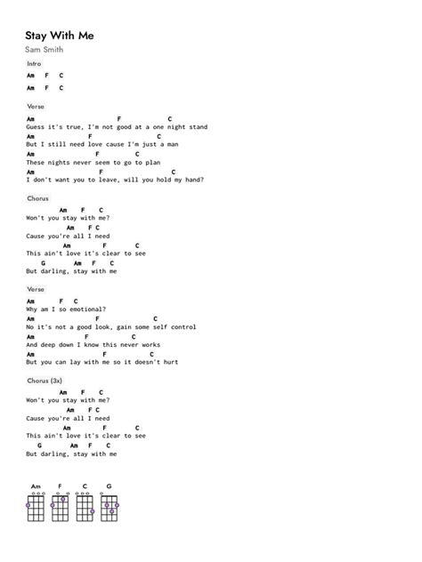 Alright, let’s get down to the nitty-gritty: the chords! Here’s a list of the key chords you’ll need to play “Stay With Me” on your ukulele. Don’t worry if these chords are new to you; we’ll go through them step by step. We’re going to use the most common and accessible chord shapes to make this as easy as possible. Remember, the key is practice and patience. With a little bit of effort, you’ll be strumming these chords like a pro in no time! Here are the chords we’ll be using, along with their ukulele finger placements. You can always search for these chords online and find diagrams if you need visual aids. However, I’ll explain them in simple terms, so you don’t need diagrams to understand. Ready?