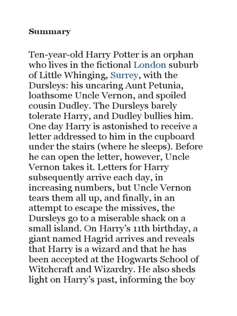 Alright, let’s kick things off with Harry Potter and the Sorcerer’s Stone , the book that introduced us to the wizarding world and our favorite scar-headed boy. Harry, an orphan living a miserable life with his cruel aunt and uncle, the Dursleys, discovers on his eleventh birthday that he’s actually a wizard. A giant named Hagrid delivers this life-changing news, along with an invitation to Hogwarts School of Witchcraft and Wizardry. Harry learns that his parents were killed by a powerful, evil wizard named Lord Voldemort, and that Harry himself miraculously survived Voldemort’s killing curse as a baby, leaving him with his distinctive lightning-bolt scar. Upon arriving at Hogwarts, Harry quickly makes friends with Ron Weasley and Hermione Granger, forming the iconic trio. He also makes enemies, most notably Draco Malfoy, a spoiled pure-blood wizard. Throughout the year, Harry and his friends become suspicious of Professor Snape, believing he’s trying to steal the Sorcerer’s Stone, a magical object that grants immortality, hidden within the school. They also discover that Voldemort, weakened but not gone, is trying to return to power by possessing the body of Professor Quirrell. In the climax, Harry confronts Quirrell, who is indeed working for Voldemort. Harry, with the help of his mother’s protective magic still lingering within him, manages to defeat Quirrell, thwarting Voldemort’s immediate plan. The book ends with Harry feeling a sense of belonging and happiness at Hogwarts, a stark contrast to his life before. This first installment is crucial as it lays the groundwork for the entire series, introducing the main characters, the magical setting, and the overarching conflict with Voldemort. We get our first taste of Quidditch, magical spells, and the general wonder of Hogwarts, setting the stage for the adventures to come. It’s a story about finding your place in the world, the power of love and friendship, and the first stirrings of courage in a young boy who never knew his own potential. The mystery surrounding the Sorcerer’s Stone and the shadowy figure of Voldemort create an engaging narrative that hooks readers from the very first page, making them eager to follow Harry’s journey.