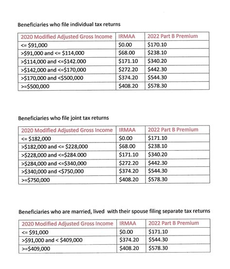 Okay, guys, let’s get into the nitty-gritty of the 2022 IRMAA brackets . Remember, these brackets determine how much extra you’ll pay for your Medicare Part B and Part D premiums based on your income. The SSA looks at your MAGI from two years prior. So, for the 2022 IRMAA brackets , they used your 2020 tax return. Keep this in mind because the income levels that decide which bracket you fall into are based on your 2020 income. The brackets are categorized into different income levels, each corresponding to a different monthly premium surcharge. The higher your income, the higher your surcharge. It’s a progressive system. Let’s break down the Part B brackets first. Part B covers things like doctor visits and outpatient care. The standard Part B premium for 2022 was \(170.10. Those who were above the income thresholds paid more than that amount. For example, if your MAGI was between \) 91,000 and $114,000 (for an individual), you would have paid a higher monthly premium. The IRMAA for Part B in that income range would be applied. The exact surcharge amount varies depending on the specific bracket. Part D, which covers prescription drugs, also has IRMAA brackets. Again, the SSA assesses your income to determine the additional premium you’ll pay. The Part D brackets are set up similarly to the Part B brackets, with different income thresholds and surcharges. It is very important to review your income for the applicable year to understand where you fall, and what surcharge you may be subject to.