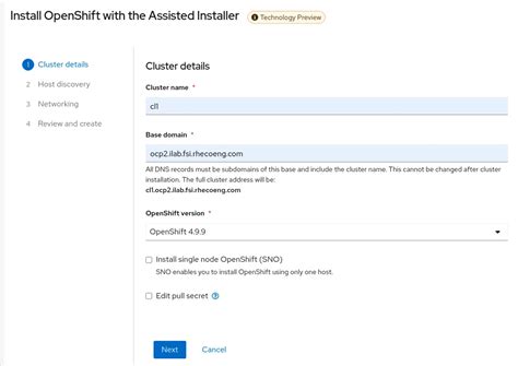 4. Enter Cluster Details: Enter the details of your cluster, such as the cluster name, base domain, and pull secret. The pull secret is required to download the OpenShift installation images from the Red Hat Container Registry.