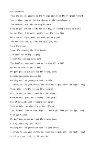 So, the first thing that hits you when “Praise God” kicks in is that unmistakable voice, repeating a phrase that sounds both ancient and incredibly powerful: “ Ode to the fallen, I’m still on my grind / Remember to be praising God all the time .” But before that, there’s the Spanish. And it’s not just a throwaway line; it’s the entry point . The lyrics go: “ En el nombre de Jesús, mi señor / Yo te alabo, mi creador / Con todo mi corazón, te doy gracias / Por tu amor y tu bondad, amén .” Let’s break this down, shall we? This translates to: “ In the name of Jesus, my Lord / I praise you, my creator / With all my heart, I give you thanks / For your love and your kindness, amen .” This isn’t just random chanting; it’s a deliberate, heartfelt prayer. Kanye is setting the tone immediately, invoking a sense of reverence and spirituality before launching into the rest of the song’s themes. This Spanish opening acts as a sacred invocation, a direct address to the divine. It’s a way to ground the song in faith, to remind listeners of the spiritual foundation that underpins the seemingly secular hustle and ambition that Kanye often raps about. Think about it: in a song about staying on your grind, about overcoming obstacles, about success, starting with a prayer is powerful. It implies that this success, this perseverance, is fueled by faith. The choice of Spanish isn’t accidental either. It adds a universal appeal, a connection to a vast community that speaks Spanish, a language rich with religious tradition. It’s a multicultural prayer, a global call to acknowledge a higher power. This opening is essential to understanding “Praise God,” guys. It’s not just background noise; it’s the foundation upon which the entire track is built. It’s a bold statement about faith being intertwined with ambition and perseverance. The repetition of “ amen ” at the end solidifies the prayer-like nature of this intro. It’s a powerful, evocative way to begin, and it immediately signals that this isn’t just another rap track; it’s a testament.