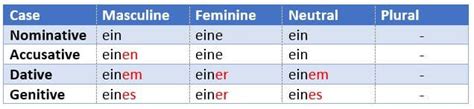 Now, this is where things get a little more complex, but totally manageable, guys. German has four grammatical cases : the nominative , accusative , dative , and genitive . The case of a noun tells you its function in the sentence – is it the subject, the direct object, the indirect object, or something else? And guess what? Our indefinite articles have to change their endings to agree with the noun’s case. This is a big difference from English. So, let’s break down how ‘ein’ and ‘eine’ (and their masculine/feminine/neuter counterparts) behave in each case.