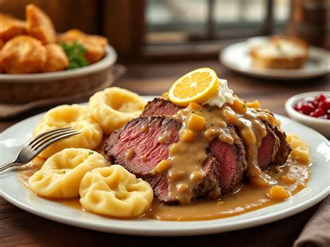 We’ve reached the final, glorious stage of creating our authentic svíčková : assembly and serving! Now that you have your fork-tender beef, your velvety smooth, perfectly balanced sauce, it’s time to bring it all together. First, slice the rested beef into thick, generous portions. You want slices that are substantial enough to hold up to the rich sauce but still tender enough to cut with a fork. Arrange these beautiful slices on a serving platter or individual plates. Now, generously ladle that luscious, creamy svíčková sauce over the beef. Make sure every slice is beautifully coated – this is what makes the dish so decadent and satisfying. The visual appeal is part of the experience, so don’t be shy with the sauce! Traditionally, svíčková is served with houskové knedlíky (bread dumplings). These fluffy, slightly chewy dumplings are the perfect vehicle for soaking up every last drop of that incredible sauce. If you can’t find or make traditional bread dumplings, other starchy sides like mashed potatoes or even egg noodles can work in a pinch, but honestly, the dumplings are highly recommended for the full experience. For that essential pop of color and contrasting flavor, svíčková is always garnished with a dollop of cranberry sauce (or lingonberry jam) and a slice of lemon . The tartness of the cranberry cuts through the richness of the sauce, while the lemon adds a bright, fresh counterpoint. Some people also add a small swirl of whipped cream on top for extra indulgence, though this is more of a modern addition. And for the purists, a few capers can add a tiny burst of briny flavor. The combination of the tender beef, the rich, tangy-sweet sauce, the soft dumplings, and the bright garnishes is simply divine. It’s a dish that speaks of comfort, tradition, and love. Serve it hot, and watch as your guests are transported to the heart of Bohemia with every single bite. This is more than just a meal; it’s an experience, a true taste of Czech culinary heritage. Enjoy your incredible homemade svíčková , you guys!