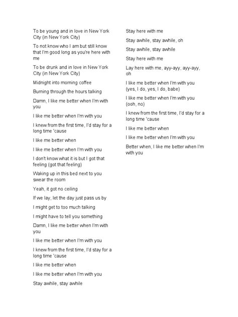 The chorus, of course, is where the magic really happens. The core of the song, that “I like me better when I’m with you” line, is a declaration of self-love through the lens of another person. It’s not just about liking someone else; it’s about seeing oneself more positively because of their presence. It’s a statement that shows how being in a healthy relationship can positively affect your perception of self. The lines that follow in the chorus reinforce this sentiment. They emphasize the feeling of being happy, comfortable, and truly at home with this person. Consider the repeated phrase “I don’t know why,” which reflects the carefree, almost inexplicable nature of love. Sometimes, the best feelings are those that defy a complete, rational explanation. It’s about the feeling of being completely yourself, without reservations, with this person. This kind of raw, genuine emotion is what resonates with so many. The entire chorus builds to a crescendo of emotion, capturing the essence of being truly in love and feeling like your best self in the process.