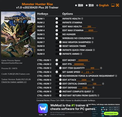 So, why would you even consider using a trainer in Monster Hunter Rise: Sunbreak ? Well, there are several reasons why players might turn to these tools. Firstly, trainers can significantly reduce the grind. Monster Hunter games are known for their extensive resource gathering and crafting systems. A trainer can provide you with unlimited materials, allowing you to craft the best gear without spending countless hours farming. Secondly, trainers can help players overcome difficult challenges. If you’re stuck on a particularly tough monster or quest, a trainer can give you the edge you need to succeed by boosting your stats or giving you access to powerful abilities. Thirdly, trainers offer a way to experiment with the game’s mechanics without the usual constraints. Want to try out different weapon builds or hunting strategies without worrying about resource limitations? A trainer can make it happen. Finally, some players simply use trainers for fun, to see how overpowered they can become or to explore the game in unique ways. However, it’s essential to remember the potential drawbacks. Using trainers can diminish the sense of accomplishment that comes from overcoming challenges through skill and effort. Additionally, there are risks involved, such as game instability and potential bans from online multiplayer modes. Therefore, it’s crucial to weigh the pros and cons carefully before deciding to use a trainer.