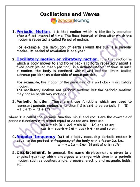 So, let’s kick things off with oscillations . In simple terms, an oscillation is a repetitive variation , typically in time, which may be a physical quantity, the magnitude of some other quantity, or the system representing it. Think of a pendulum swinging back and forth. It doesn’t just move in one direction and stop; it goes back and forth, over and over again, in a regular pattern. This back-and-forth movement is what we call oscillation. The key characteristic of an oscillation is that it’s periodic , meaning it repeats itself after a fixed interval of time. This interval is known as the period of the oscillation. The maximum displacement from the equilibrium position (the resting position) is called the amplitude . The faster the oscillation, the higher its frequency – which is simply the number of oscillations completed in one second. We often talk about Simple Harmonic Motion (SHM) when discussing oscillations. SHM is a special type of oscillation where the restoring force is directly proportional to the displacement and acts in the direction opposite to that of displacement. A mass on a spring or a simple pendulum (for small angles) are classic examples of SHM. It’s a beautiful, idealized model that helps us understand many real-world oscillatory systems. Understanding oscillations is crucial because they are the building blocks for many more complex phenomena, including waves themselves. It’s the foundation upon which much of physics is built, and once you grasp this concept, a whole new world of understanding opens up.