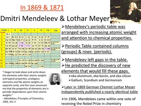 The legacy of the periodic law , pioneered by Mendeleev and Meyer, is profound and far-reaching, shaping the landscape of modern chemistry and beyond. Their work laid the foundation for understanding the relationships between elements, predicting their properties, and organizing them in a way that reveals underlying patterns. Today, the periodic table is an indispensable tool for chemists, physicists, and other scientists. It provides a framework for understanding the behavior of matter and predicting the outcomes of chemical reactions. The periodic table is used in countless applications, from designing new materials to developing new drugs. The impact of the periodic law extends beyond the realm of pure science. It has influenced our understanding of the natural world and has led to numerous technological advancements. The development of new materials, such as semiconductors and polymers, relies heavily on the principles of the periodic law. These materials have revolutionized industries ranging from electronics to medicine. In the field of medicine, the periodic table plays a crucial role in the development of new drugs and therapies. Understanding the properties of elements and their interactions allows scientists to design molecules that target specific biological processes. This has led to breakthroughs in the treatment of diseases such as cancer, HIV, and Alzheimer’s. The periodic law has also had a significant impact on our understanding of the universe. Astronomers use the periodic table to analyze the composition of stars and galaxies, providing insights into the formation and evolution of the cosmos. By studying the spectral lines of elements in distant stars, scientists can determine their chemical makeup and learn about the processes that govern the universe. Educationally, the periodic table is a cornerstone of chemistry curricula around the world. It is taught in schools and universities as a fundamental concept, providing students with a framework for understanding the behavior of matter. The periodic table helps students make connections between different elements and their properties, fostering a deeper understanding of the chemical world. The story of Mendeleev and Meyer serves as an inspiration to aspiring scientists. Their dedication to unraveling the mysteries of the elements and their willingness to challenge conventional wisdom demonstrate the power of scientific inquiry. Their legacy continues to inspire scientists to explore the unknown and push the boundaries of human knowledge. The periodic law is a testament to the power of observation, experimentation, and logical reasoning. It is a reminder that even the most complex phenomena can be understood through careful study and analysis. The periodic table stands as a symbol of scientific progress and the enduring quest to understand the fundamental building blocks of the universe.