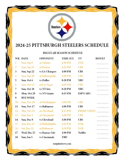 When we talk about the Pittsburgh Steelers 2024 2025 schedule , we’re diving into the heart of what promises to be another thrilling chapter in the team’s illustrious history. Folks , securing your viewing plans, understanding potential game times , and marking down key matchups are essential for any dedicated fan. The NFL schedule is always a carefully crafted beast, balancing divisional rivalries, conference clashes, and intriguing inter-conference showdowns, all designed to maximize competitive drama. Typically, the season kicks off in early September, and for the Steelers, this means jumping straight into a challenging slate of games. You can expect a mix of home games at our iconic Acrisure Stadium, where the energy is absolutely electric, and tough road tests that challenge the team’s resolve in hostile environments. We’ll face our formidable AFC North rivals twice each – once at home and once away – and these are always must-watch games . Beyond the division, the schedule will include matchups against other teams from the AFC, usually a rotating division, and then a set of games against an NFC division, adding variety and different strategic challenges to the mix. It’s not just about who we play, but when we play. Pay close attention to prime-time games , which often include thrilling Thursday, Sunday, or Monday night football slots. These are the games that garner national attention and often showcase the team’s mettle under the brightest lights. A bye week is also a critical part of the schedule, offering players a much-needed break mid-season to rest and regroup before the final push for the playoffs. Every single game day is an opportunity for the Steelers to demonstrate their strength and continue their storied legacy. Keep an eye on early-season momentum builders, mid-season tests of endurance, and the all-important late-season battles that often determine playoff berths. Guys , this season’s schedule is packed with opportunities for exciting Steelers football , and being prepared means staying informed about every twist and turn. Understanding the cadence of the season, from the opening whistle to the final playoff push, is how we truly experience the journey with our team, making sure we’re there for every single game and every single moment of Steelers magic.