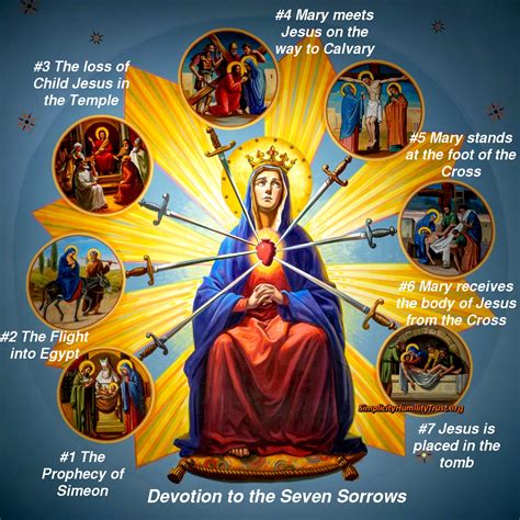 So, what exactly are the Seven Sorrows? They are seven specific events in Mary’s life that caused her immense pain and suffering, mirroring the anguish felt by her son, Jesus. Meditating on these sorrows helps us to understand the depths of Mary’s love, her unwavering faith, and her role in our salvation. Understanding these sorrows gives us a deeper appreciation for the sacrifices made for our faith. Here they are: