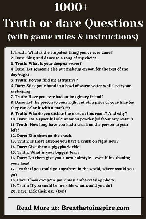 Now, let’s talk about the truth part. This is where things can get really interesting, guys. The right truth question can unlock hilarious stories, secret crushes, and maybe even a few blushing moments. Remember, the goal is to get honest answers, so the questions should be engaging enough to make people want to spill the beans, but not so invasive that they make anyone genuinely uncomfortable. Great truth questions are often a mix of lighthearted and slightly more personal, encouraging a bit of vulnerability without being cruel. For example, you could ask something like, ‘What’s the most embarrassing song you secretly love?’ or ‘If you could trade lives with anyone for a day, who would it be and why?’ These are fun, easy to answer, and can lead to some surprisingly insightful or funny responses. For a bit more of a personal touch, consider questions like, ‘What’s one thing you’re secretly proud of but rarely tell anyone?’ or ‘What’s the biggest risk you’ve ever taken?’ These encourage a bit more thought and can reveal hidden strengths or adventurous spirits. When asking truth questions , it’s important to gauge the mood of the group and the people playing. If you’re with close friends who have known each other forever, you can probably get away with more specific or inside-joke-related questions. If it’s a mixed group or people who don’t know each other well, stick to more general, universally relatable questions to keep everyone included and at ease. Some fantastic go-to questions include: ‘What’s your most irrational fear?’, ‘What’s the funniest thing you’ve ever seen online?’, ‘If you had to eat one meal for the rest of your life, what would it be?’, or ‘What’s a skill you wish you had?’ You can even get a little romantic with, ‘Who was your first celebrity crush?’ or ‘What’s the best compliment you’ve ever received?’ The trick is to keep the questions flowing, keep them varied, and always, always be prepared to answer them yourself when it’s your turn! Remember, the best truths are the ones that spark conversation and laughter, making everyone feel more connected. So, have your list ready, but also be open to creating questions on the fly based on what’s being said. That’s where the real magic happens in a game of Truth or Dare!