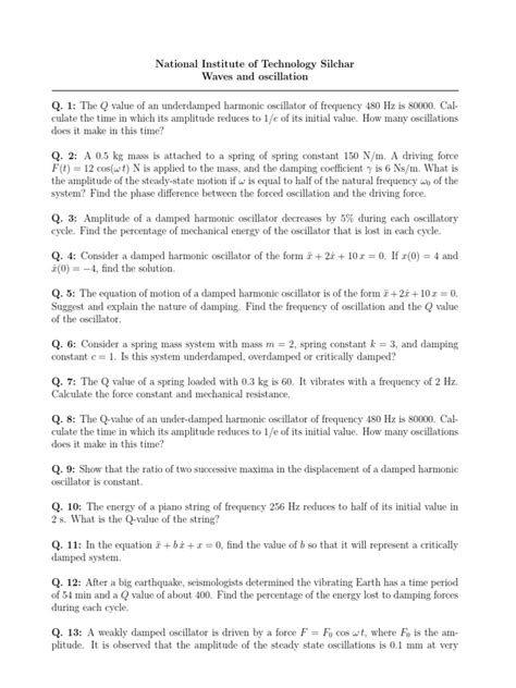 Alright guys, let’s get down to the nitty-gritty with some essential oscillation jargon . First up, we have Amplitude . This is basically the maximum displacement or extent of an oscillation, measured from the equilibrium or mean position. Think of the pendulum again; its amplitude is how far it swings out to one side. A bigger swing means a larger amplitude. Then there’s Period (T) . This is the time it takes for one complete cycle of the oscillation to occur. For the pendulum, it’s the time it takes to swing all the way out, back, and then return to its starting point. A longer period means the oscillation is slower. Closely related is Frequency (f) . Frequency is the number of complete cycles that occur in one unit of time, usually one second. It’s the inverse of the period, so if the period is long, the frequency is low, and vice versa. The unit for frequency is Hertz (Hz). Next up, Angular Frequency (ω) . This is similar to frequency but is measured in radians per second. It’s often used in mathematical descriptions of oscillations because it simplifies certain equations. The relationship is pretty straightforward: ω = 2πf. We also need to talk about Phase . Phase describes the position of an oscillating object in its cycle at a specific moment in time. It tells you where in the oscillation you are. If two objects are oscillating together, their phase difference tells you how synchronized they are. If they are in phase, they move together; if they are out of phase, they move differently. Finally, we have Damping . This refers to the gradual reduction in the amplitude of an oscillation over time, usually due to energy loss, like friction. An undamped oscillation would theoretically continue forever, but in the real world, damping always occurs to some extent. Understanding these core terms is your first big step. They are the building blocks for discussing more complex oscillatory behaviors. Keep these definitions handy, and you’ll find yourself navigating discussions about oscillations much more easily. It’s like learning the alphabet before you can read a book – these are your ABCs of oscillation! And don’t worry if it takes a few tries to really sink in; practice makes perfect, and the more you encounter these terms, the more natural they’ll become.