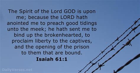 • Isaiah 61:1 : “The Spirit of the Lord God is upon me; because the Lord hath anointed me to preach good tidings unto the meek; he hath sent me to bind up the brokenhearted, to proclaim liberty to the captives, and the opening of the prison to them that are bound;” This verse is arguably the most significant in the chapter. It’s a declaration of divine empowerment and purpose. The speaker is anointed by the Spirit of the Lord, setting the stage for a ministry of restoration and hope. Think about this verse like the mission statement of the Messiah. It highlights the core of his work: preaching good news to the humble, healing the brokenhearted, and setting captives free. This verse is even quoted by Jesus in Luke 4:18-19, confirming its Messianic nature and its fulfillment in Christ. The anointing signifies being set apart for a specific task, a calling to bring about change and usher in the Kingdom of God. It’s a powerful reminder that God’s work is always about bringing freedom, healing, and hope to those who need it most.