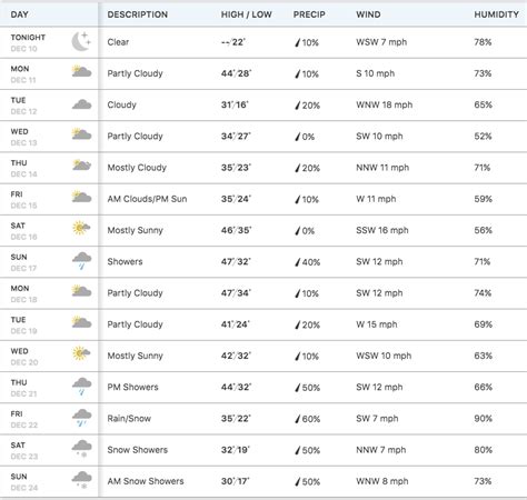 So, you’ve got your 10-day weather forecast in front of you. Awesome! But how do you actually read it without getting confused? Let’s break it down, because understanding the symbols and numbers is key to using this info effectively. Most forecasts will show you the day of the week, the date, and then icons representing the expected conditions – think sun, clouds, rain, snow, lightning. These icons are usually pretty straightforward, but sometimes there are subtle differences. A partly cloudy icon might look similar to a mostly cloudy one, so pay attention to the percentage of cloud cover if it’s provided. Temperature is usually given as a high for the daytime and a low for the nighttime. Remember, these are often predictions for a specific location, like the city center, so your exact backyard might be a degree or two warmer or cooler. Precipitation is a big one. You’ll often see a percentage chance of rain or snow. As we discussed, a 30% chance means there’s a low likelihood, while an 80% or 90% chance means it’s highly probable you’ll see some wet stuff. Don’t just look at the chance; also look at the expected amount if it’s available – a 70% chance of a light sprinkle is very different from a 70% chance of a downpour! Wind is typically shown with speed (like mph or km/h) and sometimes direction. High winds can make even mild temperatures feel colder due to wind chill. Humidity is another factor that affects how the temperature feels. High humidity can make hot days feel much hotter and cold days feel damp and miserable. Many forecasts also include a ‘feels like’ temperature, which takes wind chill and humidity into account – this is often more realistic than the actual air temperature. Don’t forget to check the timing ! A forecast might say rain is expected on Tuesday, but is it predicted for the morning, afternoon, or evening? This detail is crucial for planning your activities. Look for hourly breakdowns if they are available for a more precise picture. Finally, pay attention to the source. Reputable weather services often provide more reliable data. Comparing a couple of different sources can give you a more rounded view, especially for the later days in the forecast. By understanding these elements, you can move beyond just glancing at the icons and truly leverage the forecast for better planning.